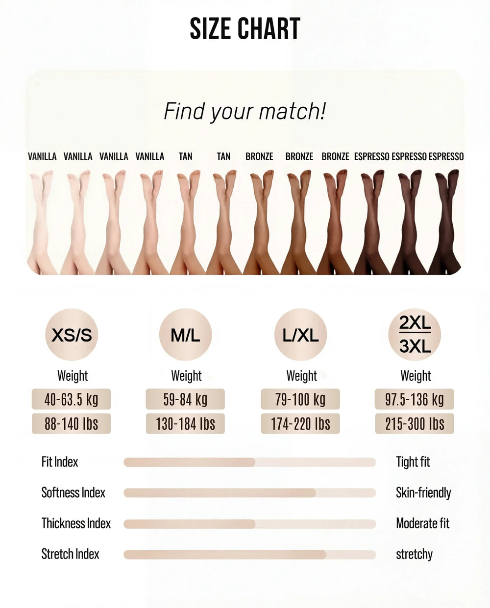 From XS to 4XL and in four skin tones, these tights truly fit every body, offering a natural and even effect.